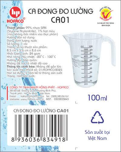 99% nhựa SAN (styrene Acrylonitrile), 1% hạt màu (màu không thôi nhiễm vào thực phẩm)