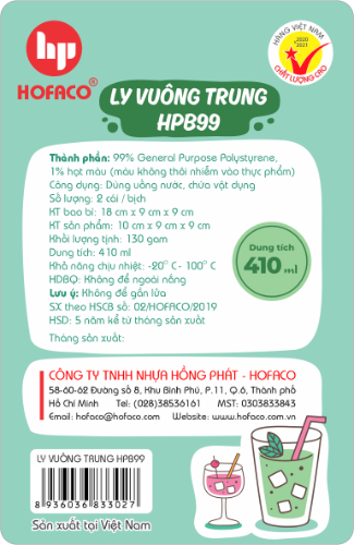 LY VUÔNG TRUNG - HPB99 được sản xuất từ chất liệu nhựa đẹp mắt, bền tốt, an toàn sức khỏe, dễ vệ sinh. Sản phẩm có thiết kế và màu sắc đẹp mắt với màu sắc nổi bật, dáng cao, dùng để uống nước, bia, nước trái cây,... Sản phẩm dùng được cho bàn ăn, bàn làm việc,...