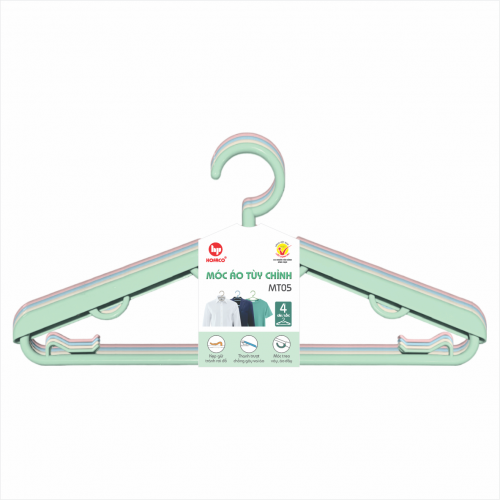 MÓC ÁO TÙY CHỈNH - MT05 được sản xuất từ chất liệu nhựa bền tốt, hạn chế phai màu, bền bỉ khi dùng lâu dài, treo móc quần áo nhanh gọn. MÓC ÁO TÙY CHỈNH - MT05 màu sắc tươi sáng, kiểu dáng đẹp mắt, phù hợp phơi áo quần, khăn tắm,... tiện lợi, gọn gàng và tiết kiệm không gian nhà bạn, là sự lựa chọn của nhiều người.
